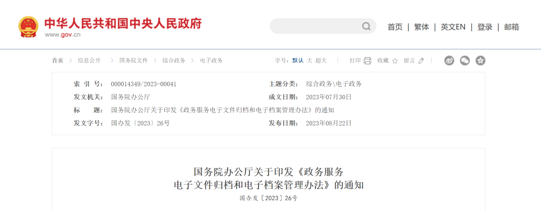 ★ 各省、自治区、直辖市人民政府,国务院各部委、各直属机构: 《政务服务电子文件归档和电子档案管理办法》已经国务院同意,现印发给你们,请结合实际认真贯彻执行。 各地区各部门要深入贯彻落实党中央、国务院关于加强数字政府建设、深化政务服务的决策部署,认真做好政务服务电子文件归档和电子档案管理工作,推动各行业各领域政务服务电子文件从形成办理到归档管理全流程电子化管理,有力支撑政务服务“一网通办”,不断提升企业和群众的获得感和满意度。 国务院办公厅 2023年7月30日 (此件公开发布) 政务服务电子文件归档和电子档案管理办法 第一条 为了推进和规范政务服务电子文件归档和电子档案管理工作,根据《中华人民共和国档案法》、《国务院关于在线政务服务的若干规定》等法律法规,制定本办法。 第二条 本办法适用于政务服务机构开展的政务服务电子文件归档和电子档案管理工作。行政处罚、行政检查等电子文件归档和电子档案管理工作可参照执行。 本办法所称政务服务机构,是指行政机关和其他负有政务服务职责的机构。政务服务,是指政务服务机构在办理依申请办理的行政权力事项和公共服务事项过程中提供的服务。政务服务办理系统,是指政务服务机构提供政务服务使用的统筹建设或者自行建设的信息系统。 本办法所称政务服务电子文件,是指政务服务机构在履行职责过程中通过政务服务办理系统形成、办理、传输和存储的数字格式的信息记录,由内容、结构、背景等组成。 本办法所称政务服务电子档案,是指具有凭证、查考价值,对国家以及社会具有保存价值,并归档保存的政务服务电子文件。 第三条 政务服务电子文件归档和电子档案管理工作应当遵循统一规划、全程管理、规范标准、高效利用、安全可控的原则。 第四条 来源可靠、程序规范、要素合规的政务服务电子文件,可以以电子形式归档并向档案部门移交,除法律、行政法规另有规定外,不再以纸质形式归档和移交。 电子档案与传统载体档案具有同等效力,可以以电子形式作为凭证使用。 第五条 国家档案局、国务院办公厅负责统筹协调全国政务服务电子文件归档和电子档案管理工作,研究制定相关政策、规章制度和业务规范。 各级档案主管部门负责监督和指导本级政务服务电子文件归档和电子档案管理工作,审查政务服务电子文件归档范围和档案保管期限,会同有关部门研究制定相关规章制度和标准规范。 各级政务服务机构负责各自职责范围内的政务服务电子文件归档和电子档案管理工作,应当推动完善政务服务办理系统归档功能,积极推进电子档案管理信息系统建设,做好政务服务电子文件形成、办理、归档和政务服务电子档案保管、利用、移交等工作。 各级档案馆应当明确政务服务电子档案移交进馆要求,建设满足电子档案长期安全管理需要的信息化基础设施、应用系统,保障政务服务电子档案规范接收、长久保存和共享利用。 第六条 各级政务服务机构应当依托全国一体化政务服务平台,积极推进政务服务办理系统与电子档案管理信息系统衔接,支撑政务服务电子文件和电子档案全流程管理。 第七条 各级政务服务机构应当依据《机关文件材料归档范围和文书档案保管期限规定》、《机关档案管理规定》、《企业文件材料归档范围和档案保管期限规定》等文件以及部门行政权力清单、责任清单、公共服务目录等确定本单位政务服务电子文件归档范围和档案保管期限,并纳入文件材料归档范围和档案保管期限表进行管理。 政务服务办理全过程中形成和调用的证据性材料、程序性材料、结果性材料等应当纳入归档范围。政务服务电子档案保管期限应不低于行政管理、诉讼、审计等活动所需的追溯年限。 第八条 政务服务电子文件一般以办件为基本单位进行归档整理,政务服务电子文件元数据和以数据共享形式调用的电子证照等电子文件及其元数据应当与该办件办理材料一并归档。涉及联合办理的政务服务,相关政务服务机构应当按照各自职责做好政务服务电子文件归档工作。 第九条 政务服务电子文件归档格式应当符合国家标准规范,并且通用、开放、不绑定软硬件。加密的政务服务电子文件应当解除加密技术手段后归档。 政务服务电子文件归档一般采用在线实时归档方式,不具备在线归档条件的,可以采用离线归档方式,归档时间最迟不能超过办理完毕后的第二年6月底。 第十条 各级政务服务机构应当按照国家有关规定,在政务服务电子文件归档、政务服务电子档案移交等环节进行真实性、完整性、可用性、安全性检测。 第十一条 各级政务服务机构应当做好本单位政务服务电子档案安全管理工作,定期开展电子档案备份,做好电子档案登记、日常检查、转换、迁移、鉴定、销毁等工作。政务服务电子文件办理过程中应当按照国家有关法律法规要求,规范使用密码技术进行保护。 第十二条 各级政务服务机构应当按照国家有关规定向档案馆移交政务服务电子档案并附具开放利用意见。各级档案馆应当做好政务服务电子档案接收工作,提升安全管理水平,按照国家有关规定对接收的政务服务电子档案进行检测,确保真实性、完整性、可用性和安全性。 政务服务电子档案移交一般采用在线移交方式,不具备条