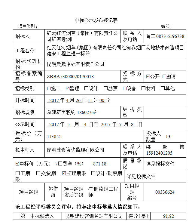 招标人:红云红河烟草(集团)有限责任公司红河卷烟厂